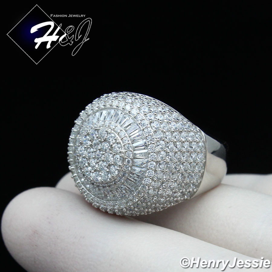 MEN 925 STERLING SILVER ICY BAGUETT DIAMOND BLING 3D SILVER ROUND RING*SR176