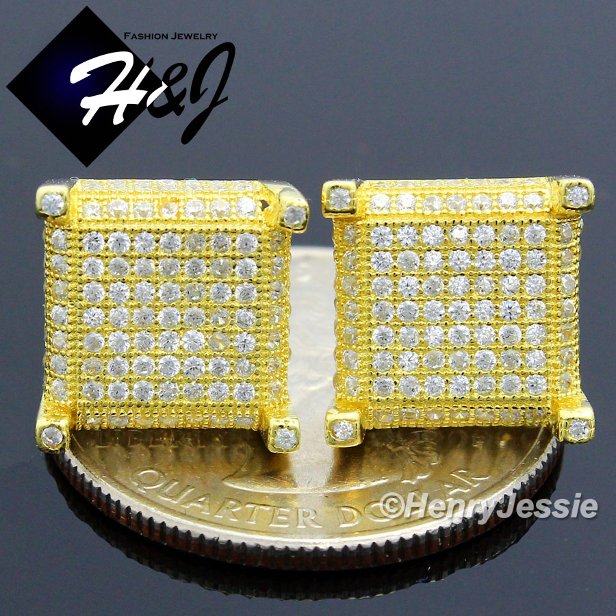 MEN 925 STERLING SILVER SQUARE 11MM LAB DIAMOND ICED GOLD STUD EARRING*E89