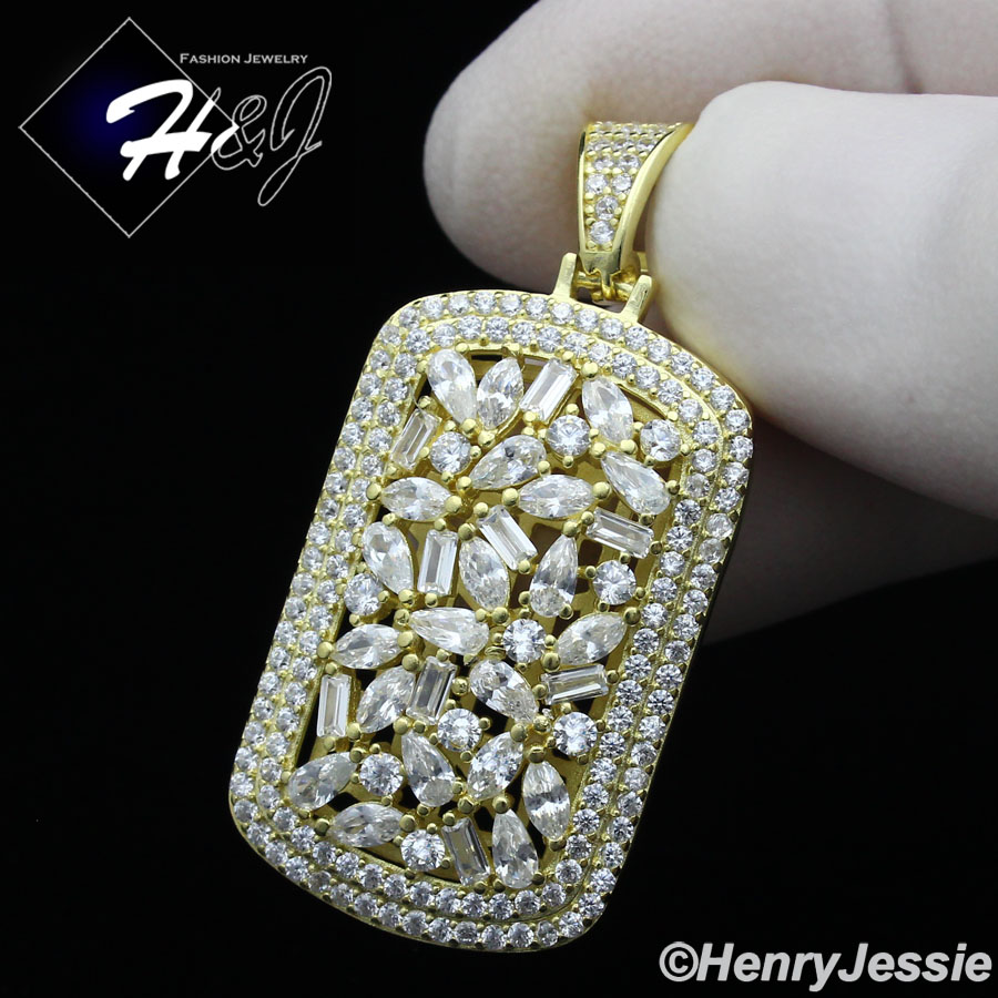 MEN 925 STERLING SILVER BAGUETTE LAB DIAMOND ICED BLING GOLD DOG TAG PENDANT*GP251